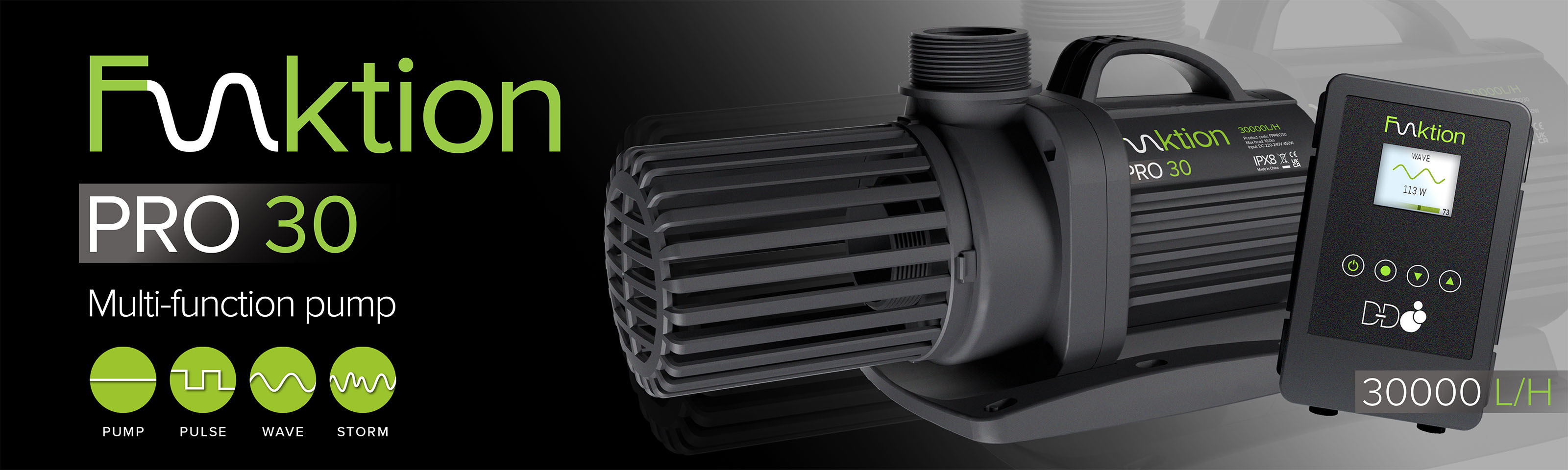 For use in salt or freshwater the Funktion PRO30 is specifically designed to be used on larger systems as a return pump or for closed loop circulation. The durable components and housing make the pump suitable for external or submerged use.
