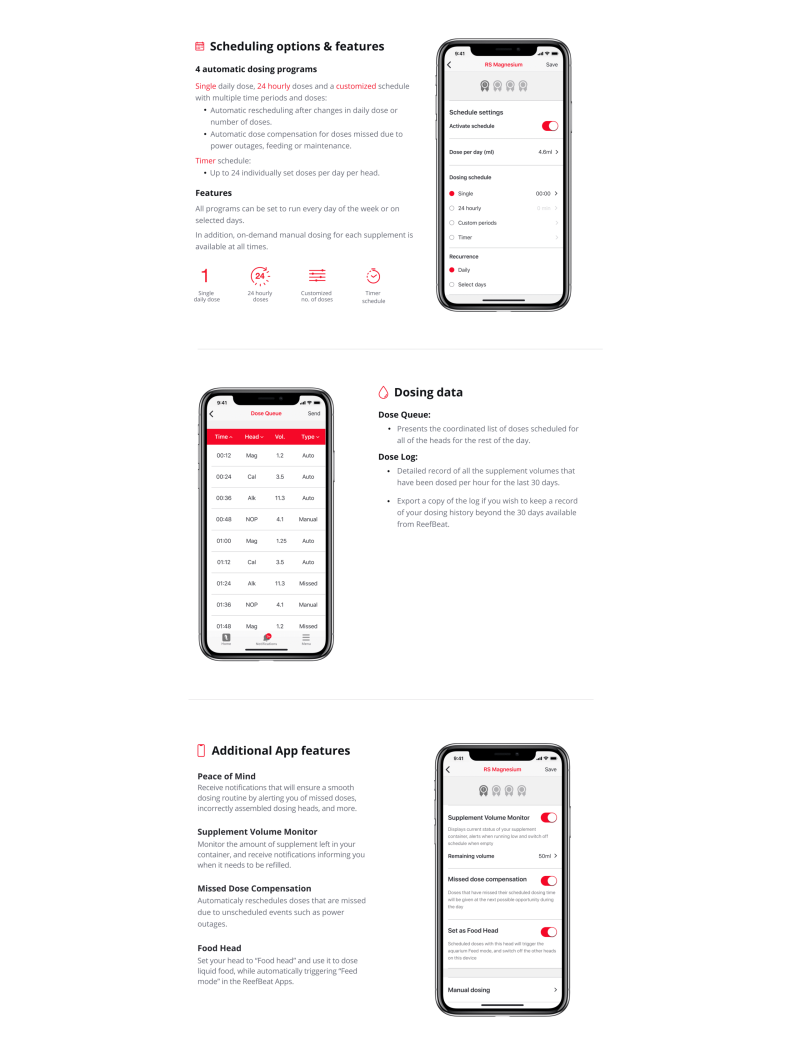 - With programming through the ReefBeat App, ReefDose offers multiple options for fully automated, easy-set dosing, or a simple schedule of individually planned doses.