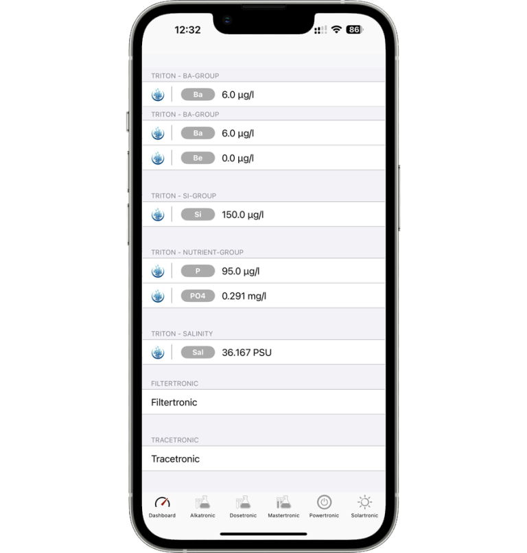 The dashboard of the AIO app shows the user the latest records of tests from the Mastertronic, Alkatronic and even light schedule of the Solartronic. A simple and intuitive view of the system’s current state.