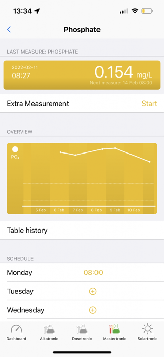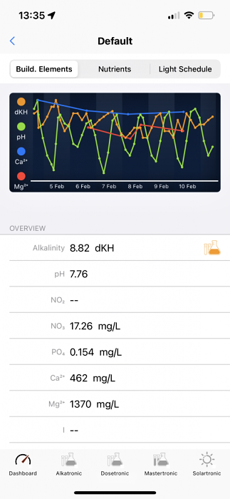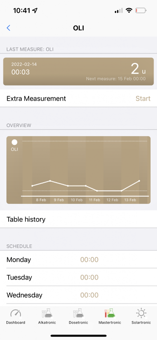 The dashboard of the AIO app shows the user the latest records of tests from the Mastertronic, Alkatronic and even light schedule of the Solartronic. A simple and intuitive view of the system’s current state.