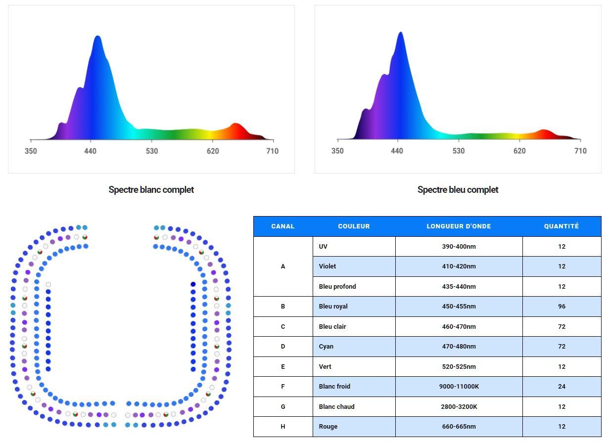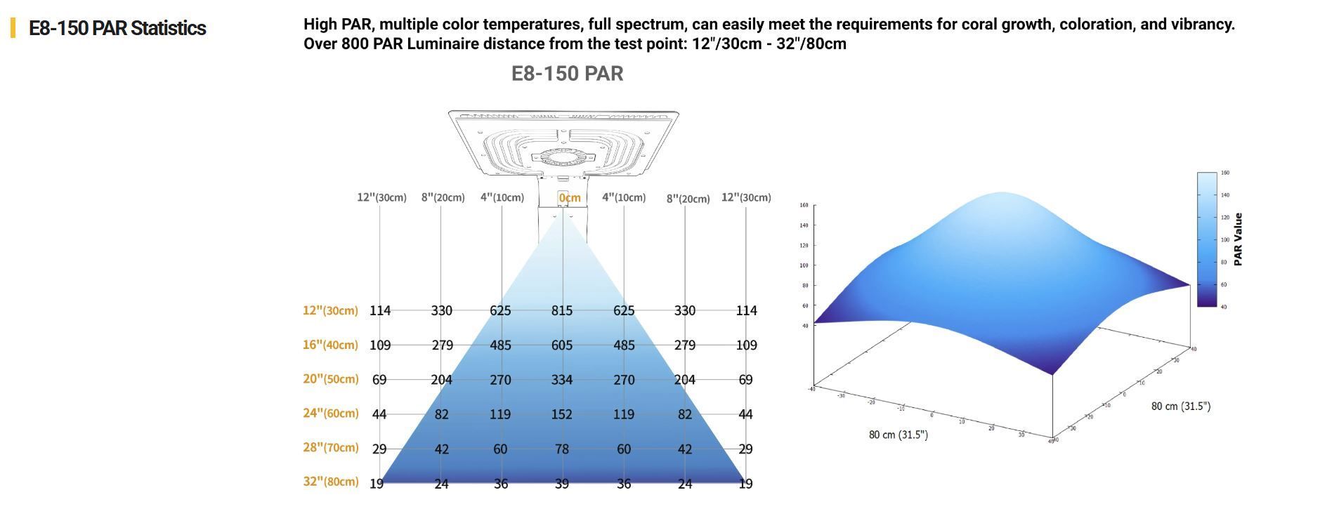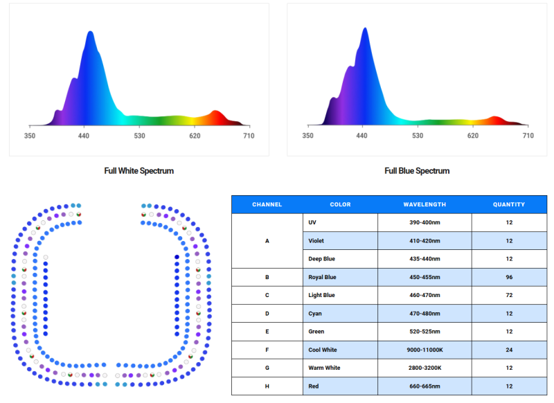 S 276 LED čipy s maximálním teoretickým výkonem 726 W využívá z tohoto obrovského množství redundantních LED čipů pouze 150W , což umožňuje plynulé přechody mezi plně modrým a plně bílým spektrem a poskytuje bezkonkurenční kontrolu nad světelným prostředím akvária.