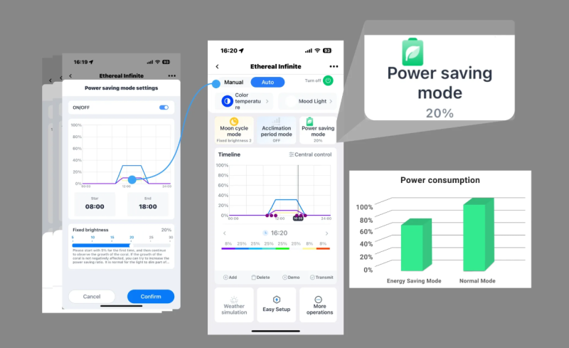 Režim úspory energie je navíc speciálně navržen tak, aby vyhovoval potřebám korálů žijících v slabém osvětlení a zároveň poskytoval dostatečné osvětlení i pro druhy žijící v silnějším osvětlení. Tato flexibilita vám umožňuje vytvořit rozmanité a prosperující prostředí akvária.