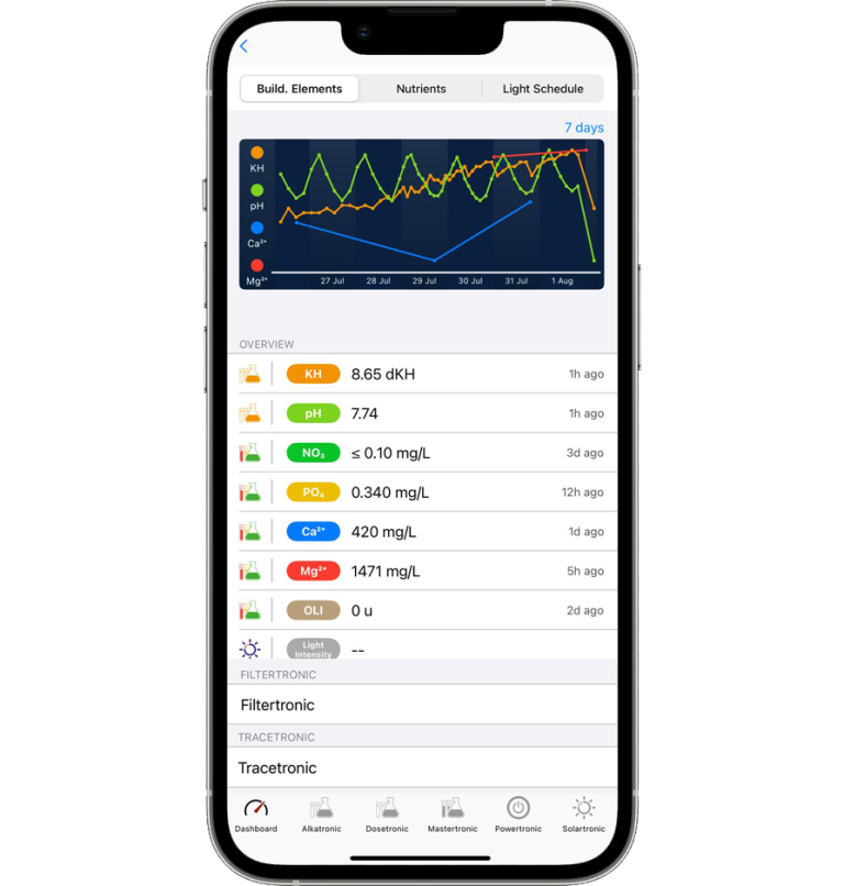 The dashboard of the AIO app shows the user the latest records of tests from the Mastertronic, Alkatronic and even light schedule of the Solartronic. A simple and intuitive view of the system’s current state.